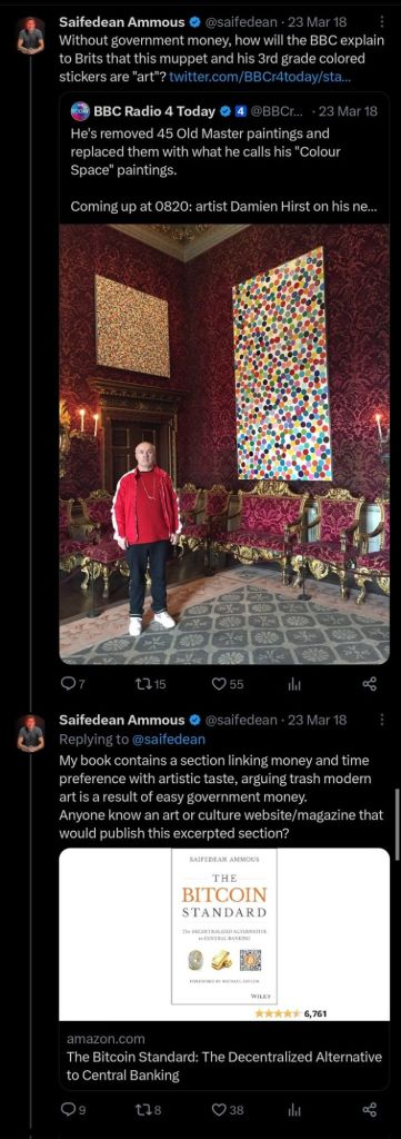 In his book “The Bitcoin Standard: The Decentralized Alternative to Central Banking,” Saifedean Ammous offers a scathingly humorous and accurate critique of modern art. Here is a summary of the points he makes: