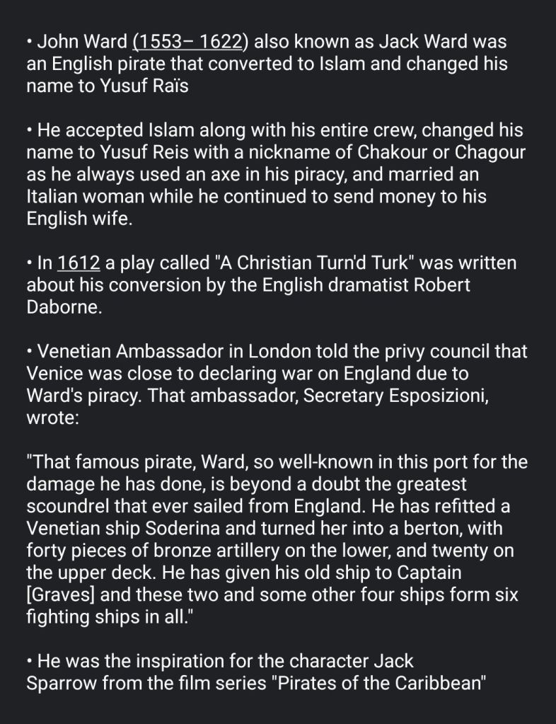 Captain Jack Sparrow from the film “Pirates of the Caribbean” was inspired by the real life story of English pirate John Ward that converted to Islam & changed his name to Yusuf Raïs.