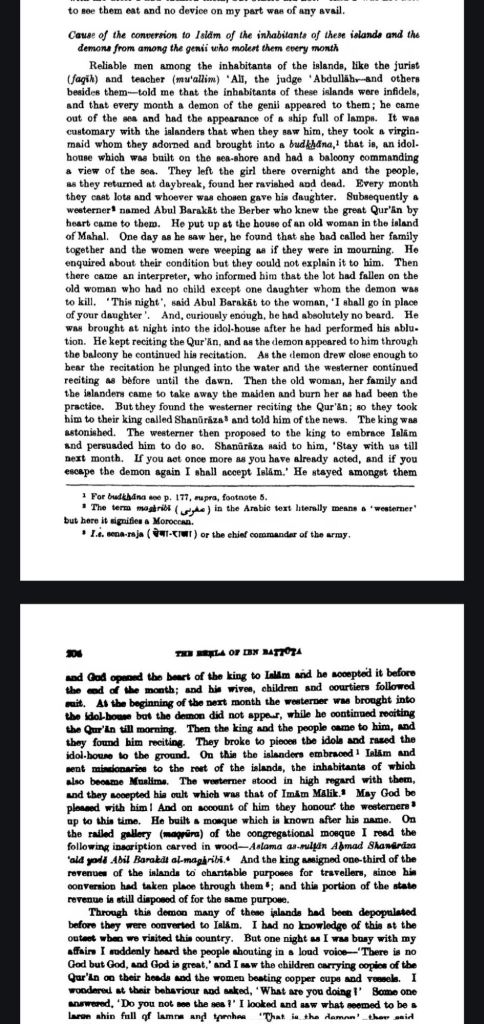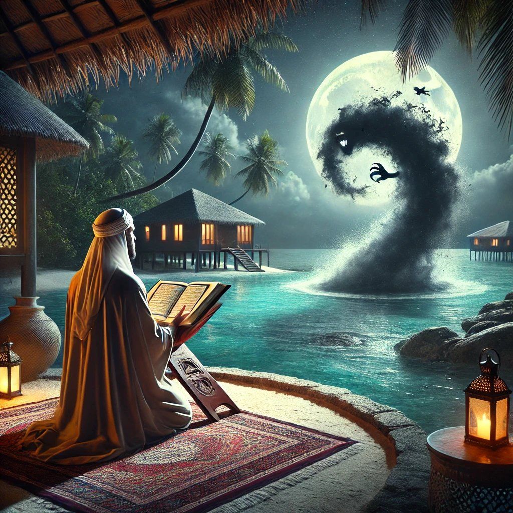 This story of how the people from the Maldives accepted Islam is fascinating. They were being terrified and essentially held hostage by an evil entity/jinn, which they believed they had to offer blood sacrifices to in order for it to leave them alone. This went on for a long time until a Berber Muslim arrived on the island and recited God’s speechโthe Quranโfor hours at the location where the demonic entity usually appeared. The Muslim successfully sent the jinn into the depths of the sea, where many of them live.