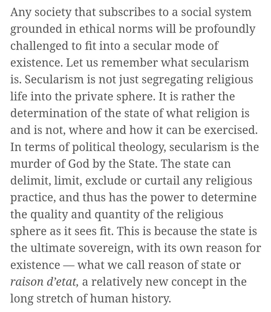 “Secularism is not just segregating religious life into the private sphere. It is rather the determination of the state of what religion is and is not,where and how it can be exercised. In terms of political theology, secularism is the murder of God by the State.”